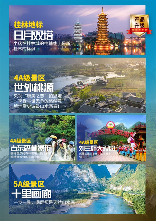 甄選行程溫馨提示:1、行程中列舉的時(shí)間為參考時(shí)間,具體出發(fā)/抵達(dá)時(shí)間以當(dāng)?shù)貙?shí)際情況為準(zhǔn),如遇到堵車,景區(qū)排隊(duì),漓江水位大小等特殊情況,游覽順序以及游覽時(shí)間根據(jù)當(dāng)?shù)厍闆r適當(dāng)安排。不再另行通知,敬請(qǐng)諒解?。。?、如因自然原因和政策性因素等造成不能參觀景點(diǎn),我社按照?qǐng)F(tuán)隊(duì)優(yōu)惠價(jià)格只現(xiàn)退門票。