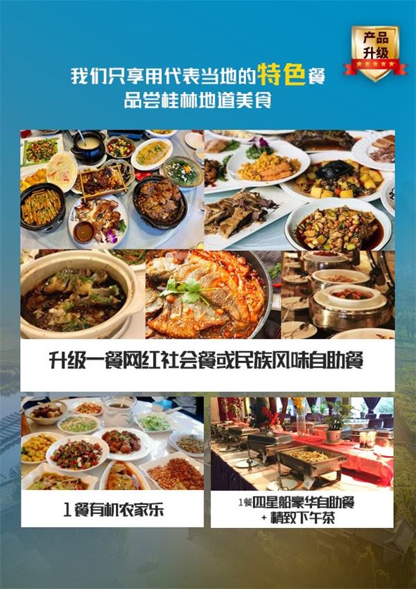 全程4早2正+1船餐(正餐30元/人/正,一餐豪華船自助、一餐有機(jī)無公害農(nóng)家樂,升級(jí)一餐網(wǎng)紅社會(huì)餐《小南國》或《金龍寨》或《謝三姐啤酒魚》或《風(fēng)味自助餐》)10人一桌8菜1湯,如人數(shù)不足將酌情減少菜量,若用餐人數(shù)不足8人,導(dǎo)游現(xiàn)退餐費(fèi);早餐在酒店為贈(zèng)送,不占床無早餐)。若自愿放棄用餐,不退費(fèi)用;若特色餐開餐人數(shù)不足則安排同等價(jià)值的退餐。