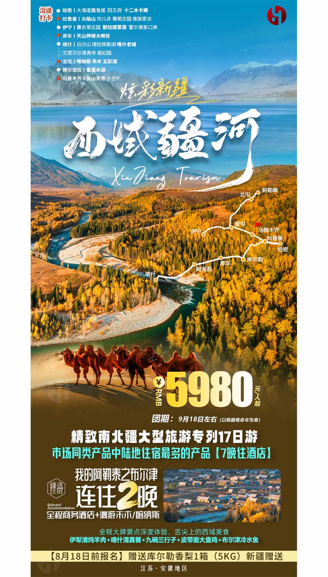 哈密(回王府、大海道魔鬼城、十二木卡姆)/烏魯木齊(天山天池、大巴扎)/吐魯番(坎兒井、火焰山、葡萄莊園、維族家訪)/阿勒泰(海上魔鬼城、喀納斯、禾木、五彩灘)/博爾塔拉(賽里木湖)/伊寧(霍爾果斯口岸、那拉提草原)/庫車(天山神秘大峽谷)/喀什(白沙湖、喀拉庫勒湖、艾提尕爾清真寺、香妃園、喀什古城)南北疆空調(diào)旅游專列17日游