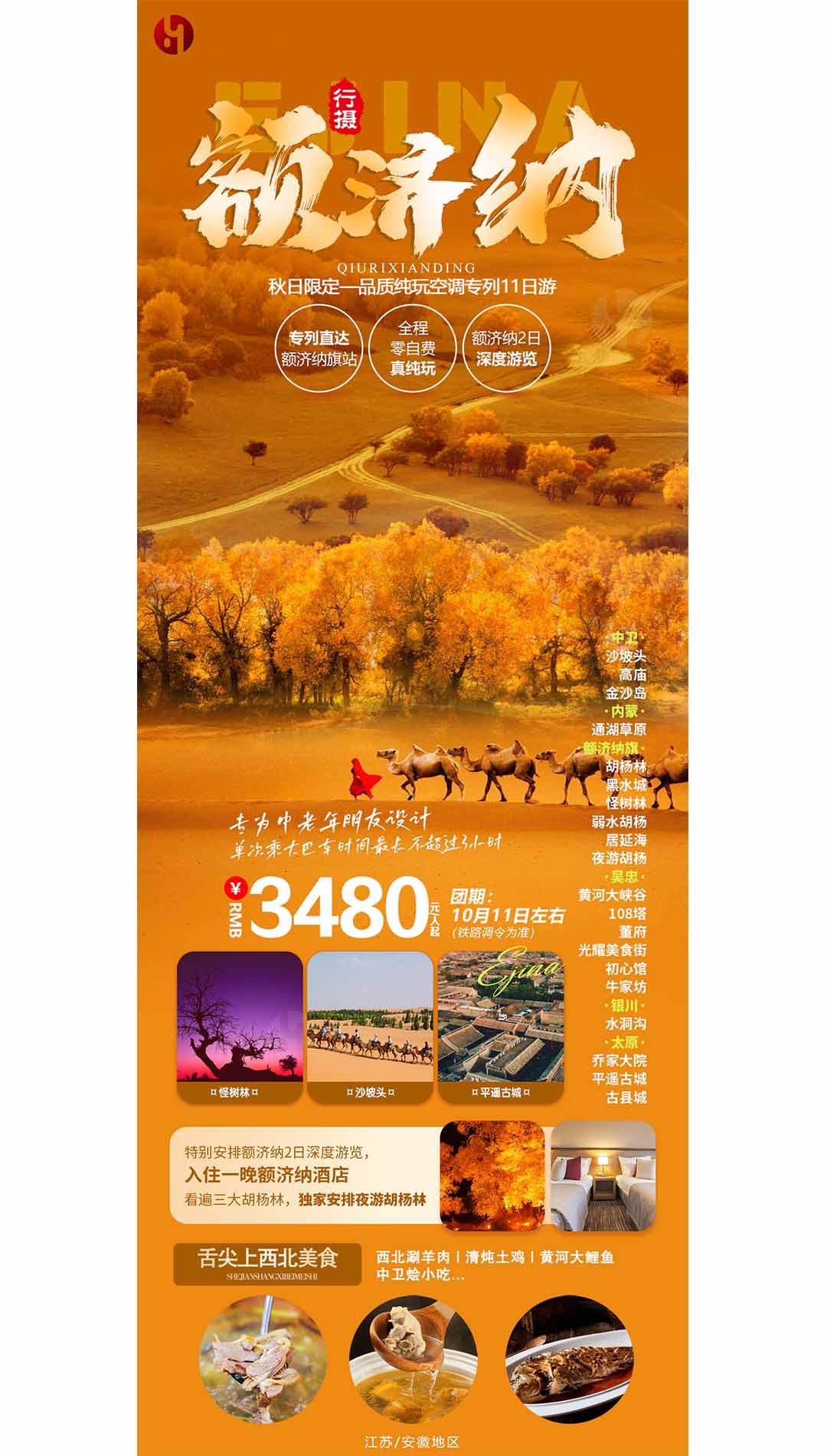 中衛(wèi)(沙坡頭、高廟、金沙島)、內(nèi)蒙(通湖草原)、額濟(jì)納旗(胡楊林、黑水城、怪樹(shù)林、弱水胡楊、居延海、夜游胡楊)、吳忠(黃河大峽谷、108塔、董府、光耀美食街、初心館、牛家坊)、銀川(水洞溝、沃夫百瑞)、太原(喬家大院、平遙古城、古縣城)