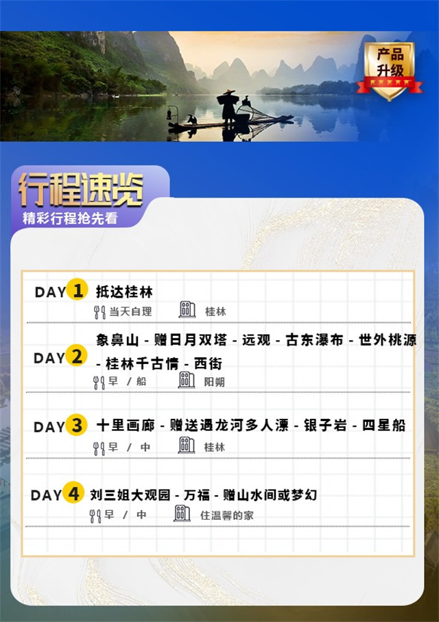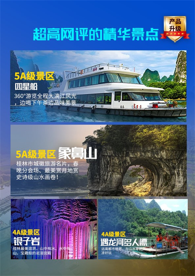 甄選行程溫馨提示:1、行程中列舉的時間為參考時間,具體出發(fā)/抵達(dá)時間以當(dāng)?shù)貙嶋H情況為準(zhǔn),如遇到堵車,景區(qū)排隊,漓江水位大小等特殊情況,游覽順序以及游覽時間根據(jù)當(dāng)?shù)厍闆r適當(dāng)安排。不再另行通知,敬請諒解?。?!