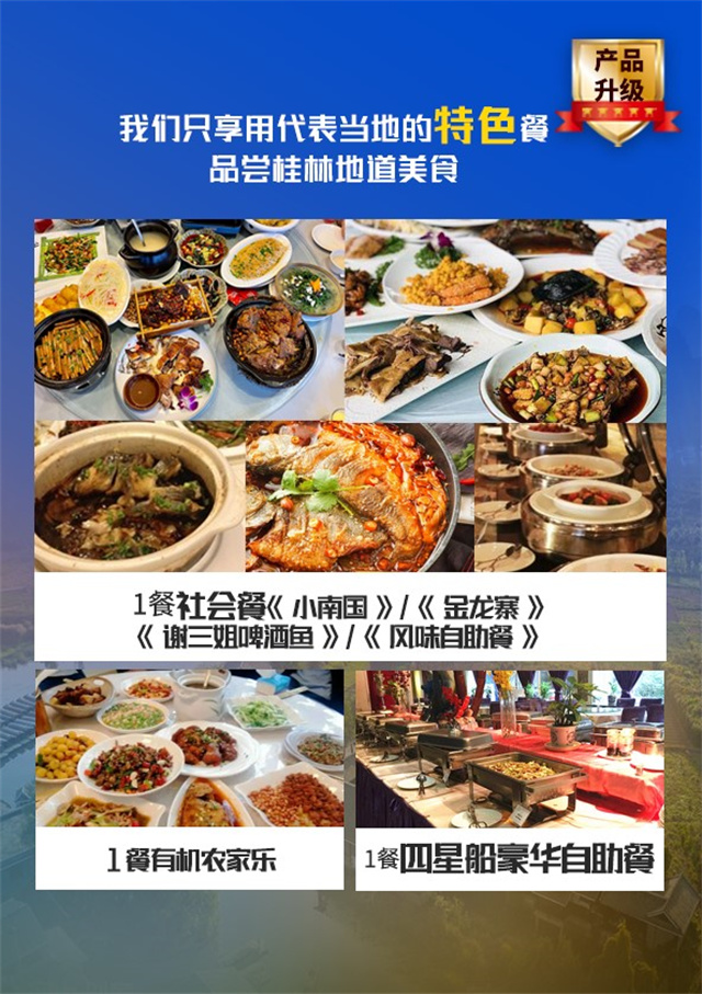 備注:桂林為國家三線以下旅游城市,酒店各項標(biāo)準(zhǔn)偏低,主要以衛(wèi)生舒適為主,提前做好心理準(zhǔn)備哦!如客人對上述參考酒店安排不滿意,處理方案如下:1、按實收價格退給客人自行訂房,2、可自補(bǔ)當(dāng)時差價升級客人滿意的更高標(biāo)準(zhǔn)酒店!3如若遇以上酒店無房情況下,可安排同等酒店,如我社拿到比計劃酒店檔次更高且價格等同的情況下,可以給客人免費升級!